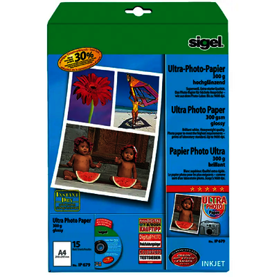 Für Ausdrucke wie aus dem Photolabor! Die Farbbrillanz ist faszinierend. Die superweiße Oberfläche sorgt für kontrastreiche Ausdrucke. Die weiche Farbabstufung auf diesen Papieren liefert perfekt realistische Hauttöne. Ultra-Photopapiere sind sofort nach dem Ausdrucken trocken und können deshalb sofort verwendet werden. Bis zu 30% weniger Tintenverbrauch sind möglich (Infos in jeder Packung). Mit Sigel Ultra-Photo-Papieren erreichen Sie bei geeigneter Aufbewahrung eine Lichtbeständigkeit bei pigmentierter Tinte bis zu 91 Jahren, bei wasserlöslichen Tinten bis zu 23 Jahren (lt. Rochester Institute of Technology) Format A4