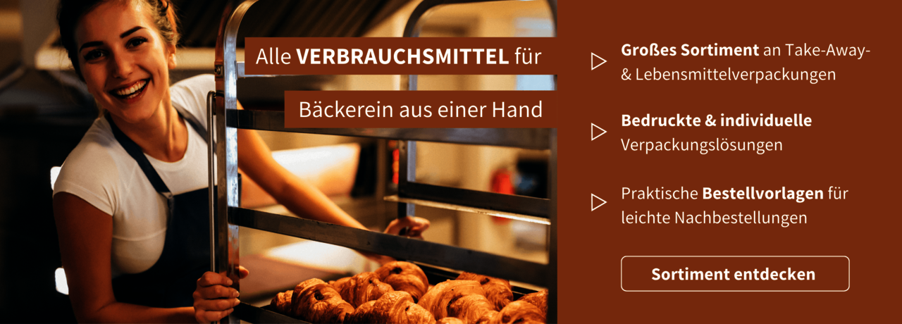 Ob frisches Croissant, kunstvoll verpackter Gugelhupf oder heißer Cappuccino für unterwegs – mit den durchdachten Verpackungslösungen von MESSERLE setzen Bäckereien ihre Produkte perfekt in Szene. Als Komplettanbieter liefern wir Ihnen alles aus einer Hand: von hochwertigen Faltenbeuteln über Kuchen- & Feingebäckverpackungen bis hin zu nachhaltigen Coffee-To-Go Bechern. Ergänzt wird unser Sortiment durch Table-Top-Produkte sowie professionelle Hygiene- und Reinigungsartikel.