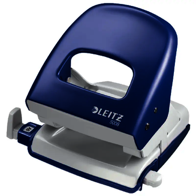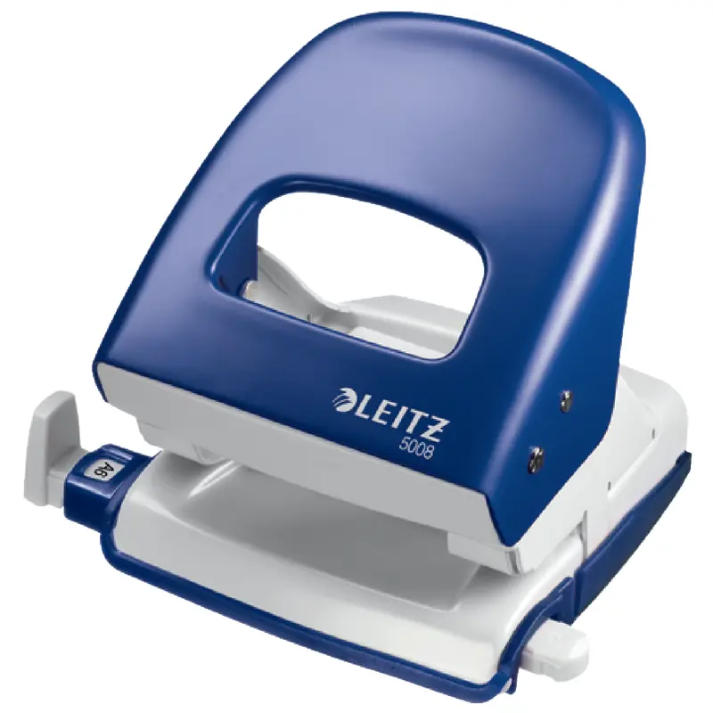 VOLLMETALL-Schreibtischlocher mit 5,5mm Lochdurchmesser und gutem Stanzvermögen. Anschlagschiene einstellbar auf die Formate A4, A5, A6, Folio, US-Quart und 8x8x8cm. Rutschfester Plastikboden, möbelschonend, bequem zu entleeren. 5 Jahre Garantie.