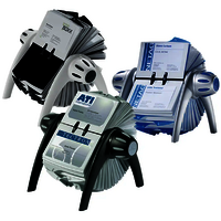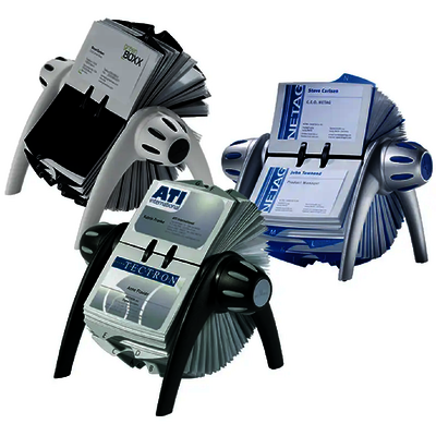 Rotationskartei für die Archivierung von Visitenkarten. Aus hochwertigem, beschichtetem Kunstoff in exklusivem Design. Mit 200 Visitenkartenhüllen im Format 72x104mm, beidseitig nutzbar, für 400 Visitenkarten. Alphabetisches 25teiliges Register von A-Z. Rationelles Bestücken der Hüllen mit Visitenkarten durch leichtes Entnehmen und Einstecken der Visitenkartenhüllen.