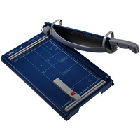 Mit Sicherheitsautomatik ausgestattet (Messerschutz), geschliffenes Ober- und Untermesser. Automatische Pressung. Verstellbarer Rückanschlag. Winkelanlage. Vorgegebene DIN-Formate und cm-Teilung auf dem Tisch. Farbe blau. GS-Zeichen.