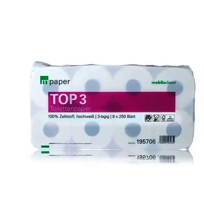 Mobiloclean - das weiche, feine Tissue Toilettenpapier aus 100% Zellstoff. Blattabmessung 9,6x11cm, 9 x 8 Rollen à 250 Blatt, unterverpackt, weißlich