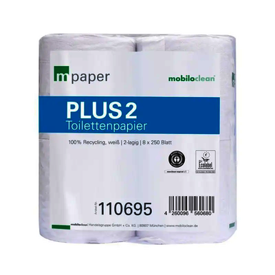 Mobiloclean - das weiche, feine Tissue Toilettenpapier aus 100% Altpapier. Blattabmessung 9,5x11cm, 8 Rollen x 250 Blatt unterverpackt, weißlich