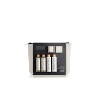 Handgepäckset aus Baumwolle mit Reißverschluss für Haar- und Körperpflege-Produkte. Enthält: 1x Duschgel in einer 100-ml-Flasche, 1x Shampoo in einer 100 ml Flasche, 1x Haarspülung in einer 100-ml-Flasche, 1x Bodylotion in einer 100 ml Flasche, 1x Seife 50 g und 1x Seife 35 g. Sämtliche Pflegeprodukte sind Bio-zertifiziert.