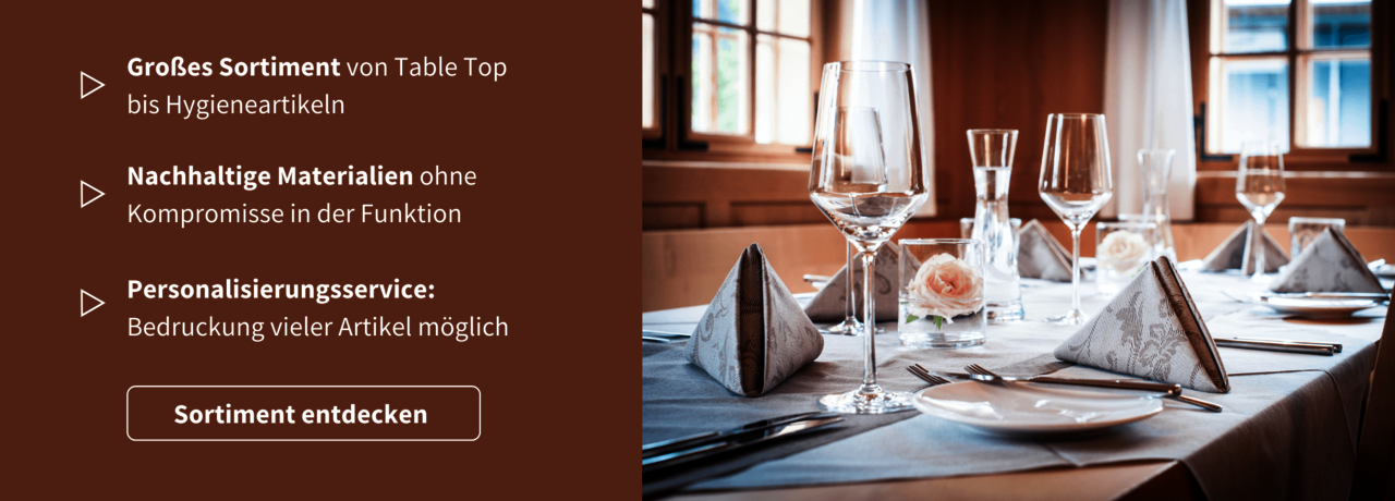 Ein schön gedeckter Tisch ist das Aushängeschild jedes Restaurants. MESSERLE bietet Ihnen eine große Auswahl an Servietten, Tischdecken, Platzsets und Accessoires, die Qualität und Design perfekt vereinen. Unsere Table-Top-Lösungen sorgen für ein stimmiges Gesamtbild – vom Fine Dining bis zur modernen Bistro-Atmosphäre.