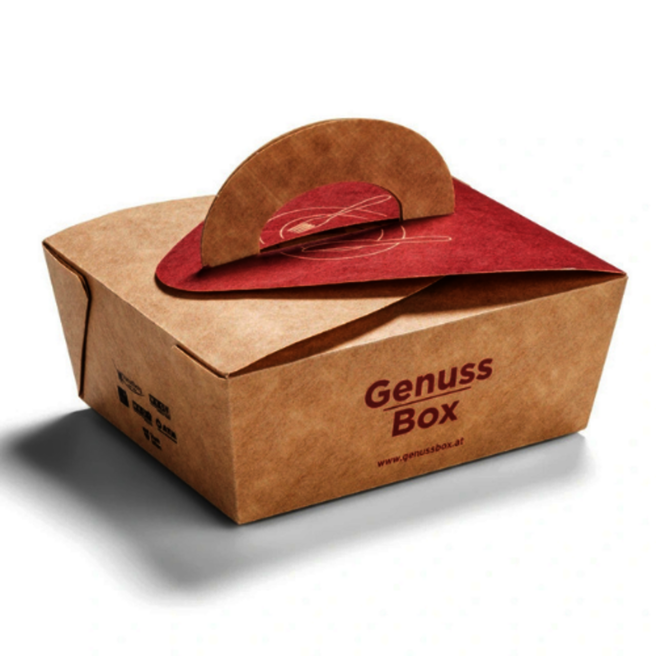 Mit der GenussBox bieten Sie Ihren Gästen eine stilvolle Möglichkeit, Speisen mitzunehmen – und setzen gleichzeitig ein sichtbares Zeichen für den bewussten Umgang mit Lebensmitteln.