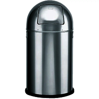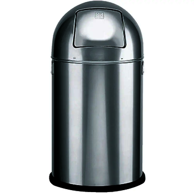 Lackierter Stahlblech-Abfallsammler mit verchromter Push-Klappe und feuerverzinktem Einsatz. Geeignet für Aschenbecherentleerung.