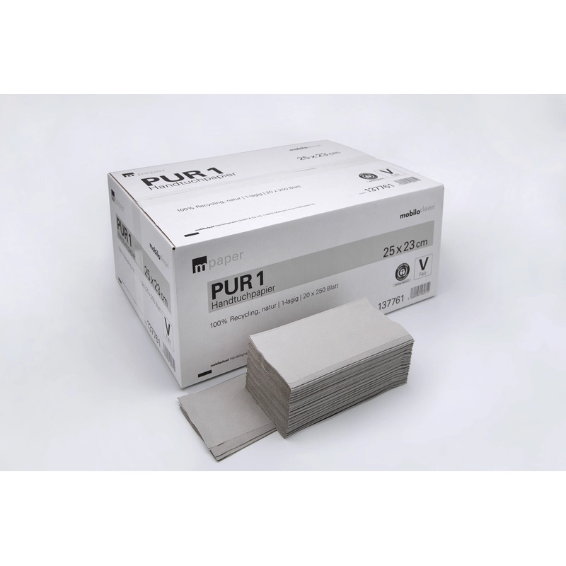 | Farbe: grau | Material: 100% Recycled aus Altpapier | Lagen: 1-lagig | Maße gefaltet cm: 24,5 x 11,5 | Blattanzahl: 250 | Falzung: V-Falz | Blattgröße in cm: 24,5 x 23 | Packungsinhalt: 20 Pkg x 250 Blatt |