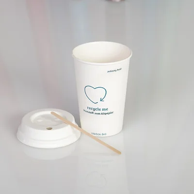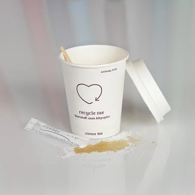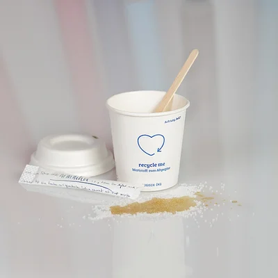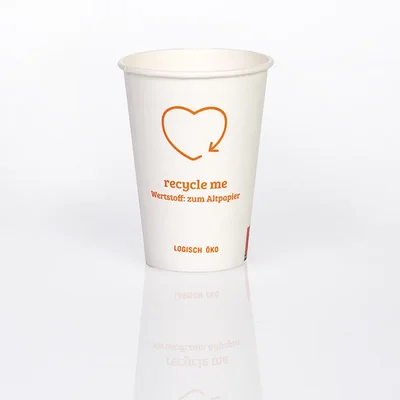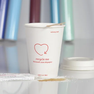 Automatenbecher mit Herzmotiv für Heißgetränke. Hergestellt in Europa aus reiner Frischfaser mit Beschichtung für eine optimale Kreislaufwirtschaft.