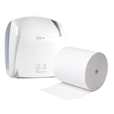Set bestehend aus [e] one Handtuchspender e1 Autocut weiß + eine Handtuchrolle e1 Pure Food weiß.