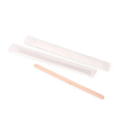 Einweg-Rührstäbchen aus Holz, einzeln verpackt zum Umrühren von Tee oder Kaffee.