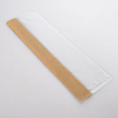 SPEZIAL - Snackbeutel mit maximalem Format des Sichtfenster - ohne Druck - ausgeführt, mit nur einer Seitenfalte auf der Papierseite, aus fettdichtem braunem Pergamentersatz-Papier, mit Sichtfenster aus OPP-Folie, mikroperforiert.