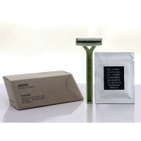 Rasierset in Prisma-Kartonage aus recyceltem Papier mit Precut, Inhalt: Doppelklingenrasierer in recycelter Kunststofffolie und feuchtigkeitsspendende Rasiercreme im Sachet 6ml, Öko Anyah.