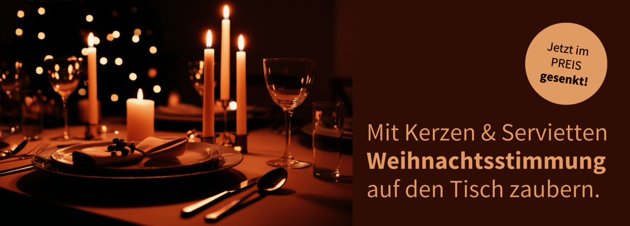 Mit wenigen Handgriffen entsteht aus jedem Tisch eine festliche Weihnachtstafel. Unser kuratiertes Sortiment aus hochwertigen Kerzen und stilvollen Servietten bringt sofort Wärme, Eleganz und festliche Stimmung in Ihr Restaurant, Hotel oder Zuhause. Alle Produkte sind umgehend lieferbar, attraktiv reduziert und perfekt aufeinander abgestimmt – für unkomplizierte, moderne und authentische Weihnachtsdekoration.