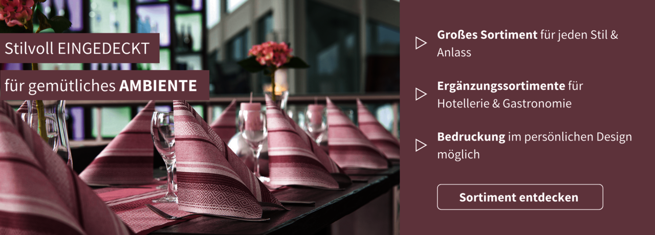 Zur Auswahl stehen zahlreiche Materialien wie Airlaid, Tissue oder Baumwollmischungen – in verschiedenen Farben und Qualitäten. So entsteht ein perfekt abgestimmter Auftritt, der Eindruck hinterlässt.