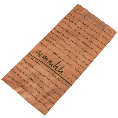 Bäckerbeutel ungefädelt aus Kraftpapier braun gerippt, mit farbigem Positivdruck.