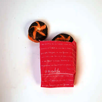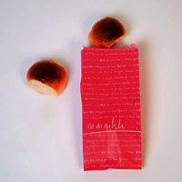 Bäckerbeutel ungefädelt aus weißem Kraftpapier, großflächig farbig bedruckt.