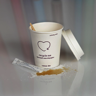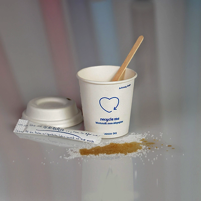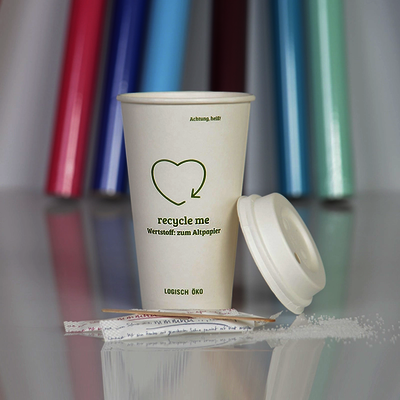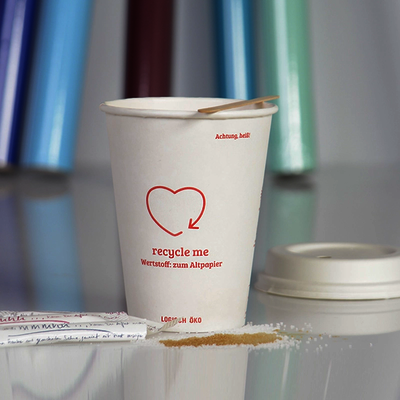 Becher mit Herzmotiv für Heißgetränke. Hergestellt in Europa aus reiner Frischfaser mit Beschichtung für eine optimale Kreislaufwirtschaft.