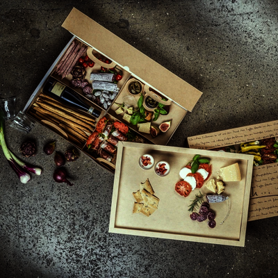 Unterschiedliche Einsätze machen die Cateringkartons zu wahren Multitalenten. Hergestellt aus Papier für leichtes Recycling.