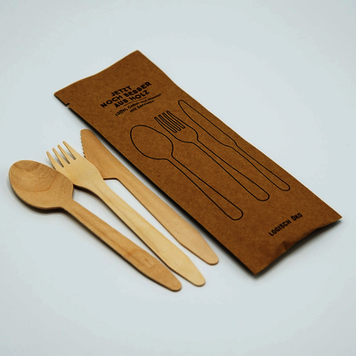 Unser 4-teiliges Holz Besteckset, verpackt in einer braunen Bestecktasche aus Kraftpapier, ist recycelbar und zu 100% biologisch abbaubar. Durch Biowachs erhält das Holzbesteck seine seidige Oberfläche. Die Bestecksets können sowohl für kalte als auch warme Speisen verwendet werden. Ideal sind sie für große und kleine Veranstaltungen oder Take Away Mahlzeiten.