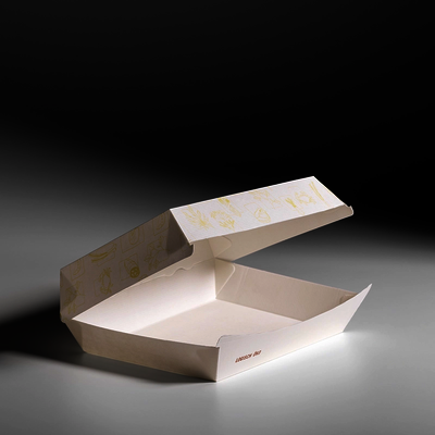 Praktische Pommesbox aus innovativem HT-Board®, die Design mit Nachhaltigkeit verbindet und eine perfekte Alternative zu Alu- und Frischhaltefolien darstellt. Hergestellt in Europa und geeignet für kalte, heiße, halbflüssige und gefrorene Speisen.