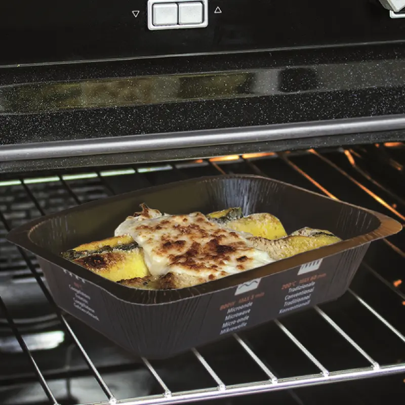Wasser- und fettundurchlässige und siegelbare Pappschalen mit PET-Auskleidung.